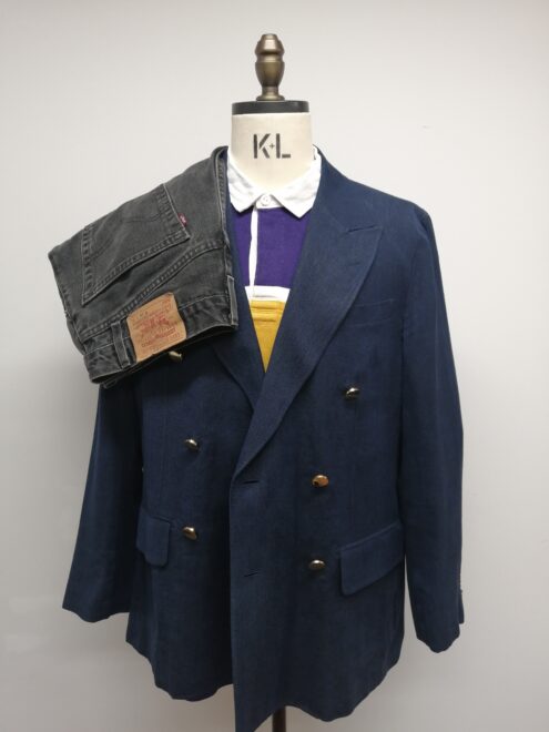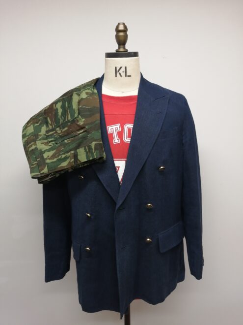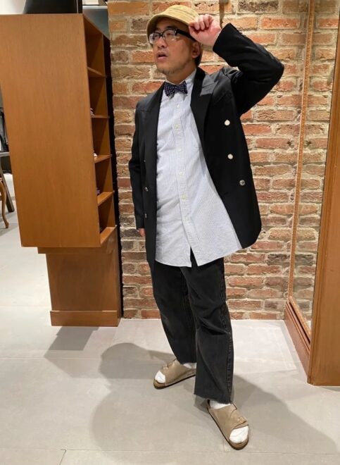 👆今回のアイテムはリネン素材の春夏仕様のWブレストブレザー。最近は前を止めずにゆるい感じでカジュアルミックスが板垣洋品店流です!!