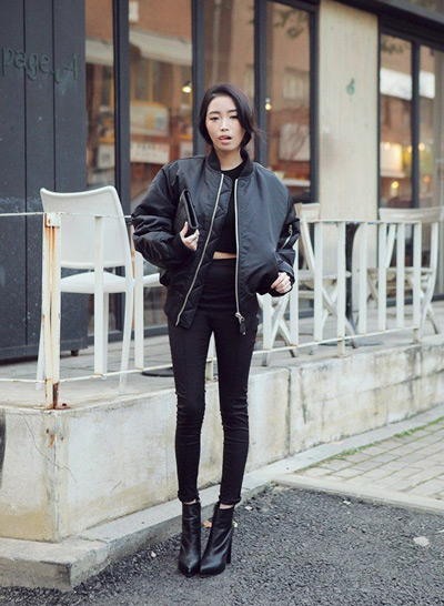 エレガントにモノトーンでまとめてモード感が強めなスタイル。黒のMA-1がきいてます。