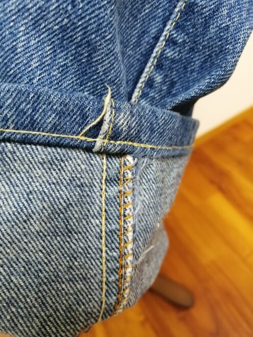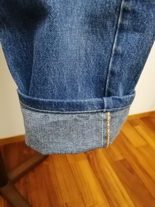 👆片倒しのチェーンステッチ仕様です。ミミがなく脇割り仕様でもありません。