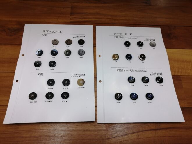 多少のアップチャージで細部まで変更可能です。ボタンや裏地などはもちろんお選びいただきます。