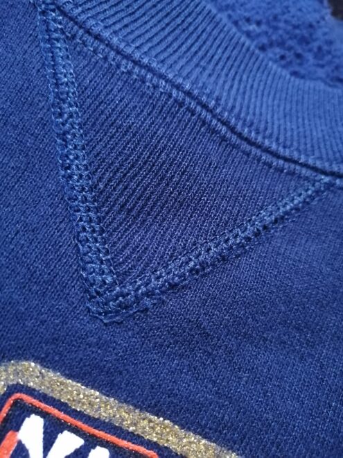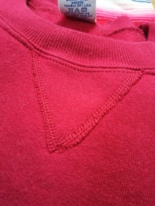 俗に言われる【前V】。ガゼット。汗ドメと生地の縮み防止の仕様。60年代くらいまでのVintageスウェットに見られる仕様。ですので今回のは90年物