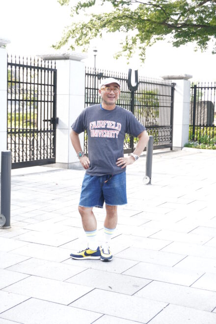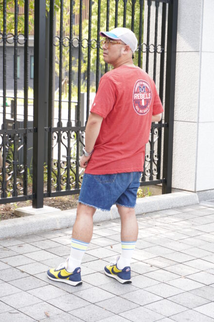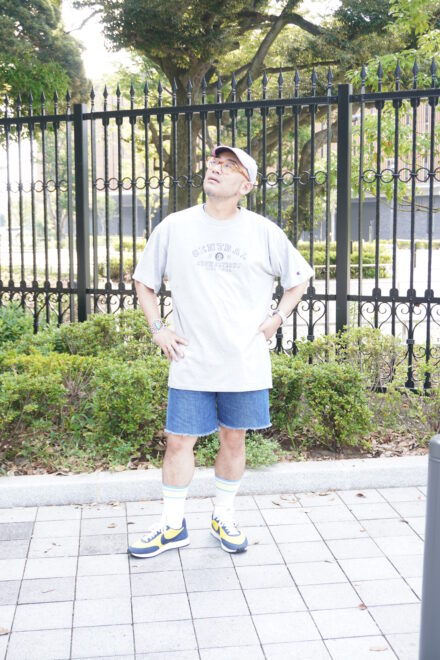 海外モデルのチャンピオンTシャツ。アメカジな雰囲気ありますね~。