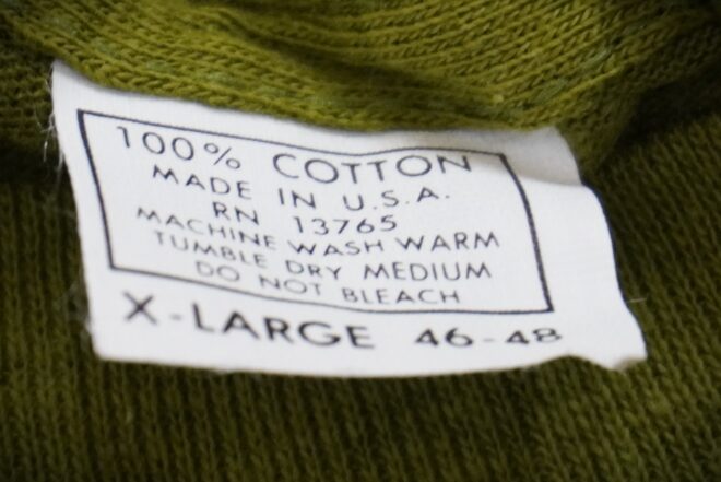 →サイズはLとXL。70~80年代ころの製造品。見た目はほぼリアルです。民間の製造品ですがアメリカ製の未使用品。ヴィンテージと言っても良いのではないかと思います。着丈長め、タックイン可能なスペック。ブレザーにインに最高に合います。