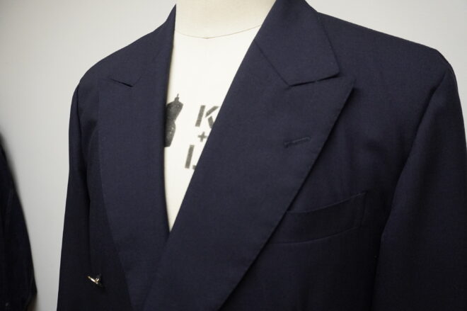 Wジャケットの基本はラペルがピーク。最近のモデルが控えめピークもあります。軍服や宮廷服の名残です。