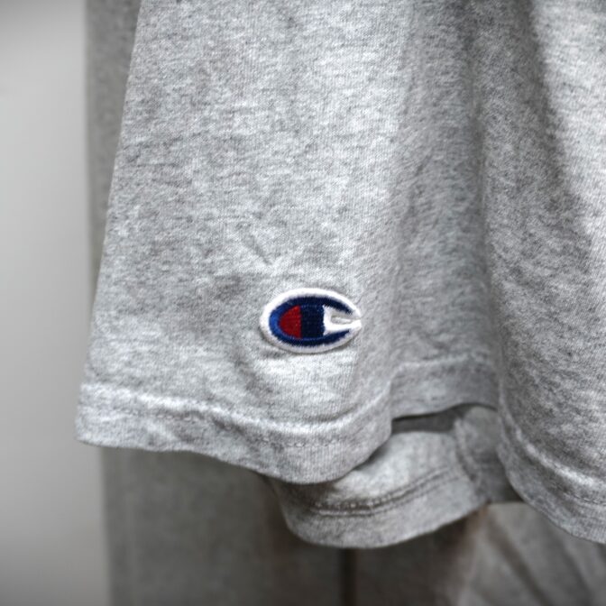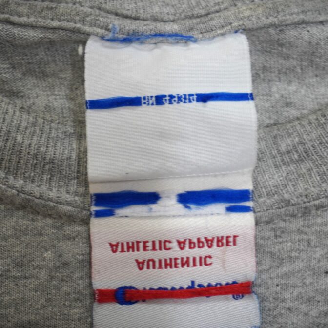 ◆アメリカンなカレッジロゴがChampionらしいTシャツです。色褪せや脇部に変色がありますが着用に問題ないかと思います。ネック部のタグが半分とれてますが古着の味として捉えて頂ければと思います。サイズXL、カラーグレイ、表記消えてますがコットン素材かと思います。