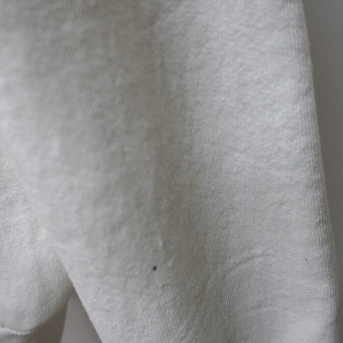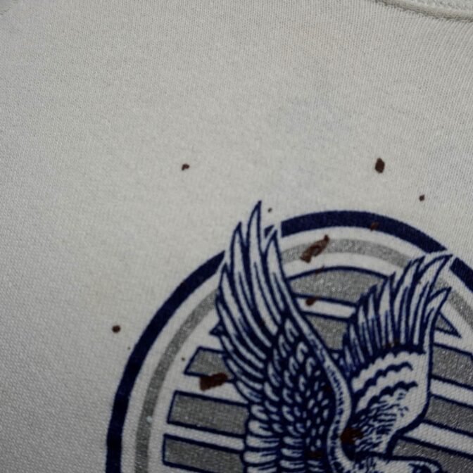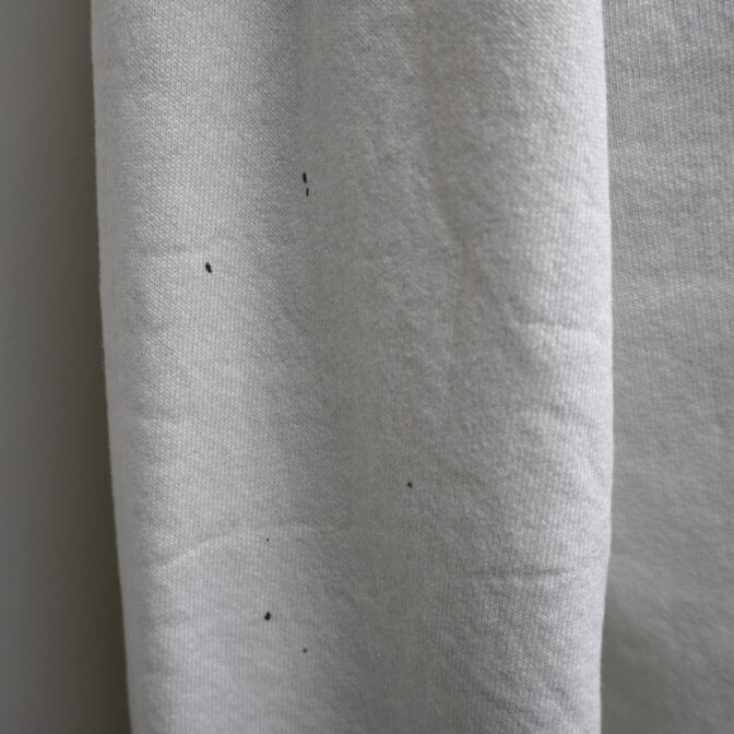 ベースが白で細かい汚れ(ペンキのような)があります、両袖、フロント部にありますがエイジングとして捉えたらデザインの一環として捉えて頂けるかと思います。雰囲気が良いです。ラグランスリーブで楽に着用できます。