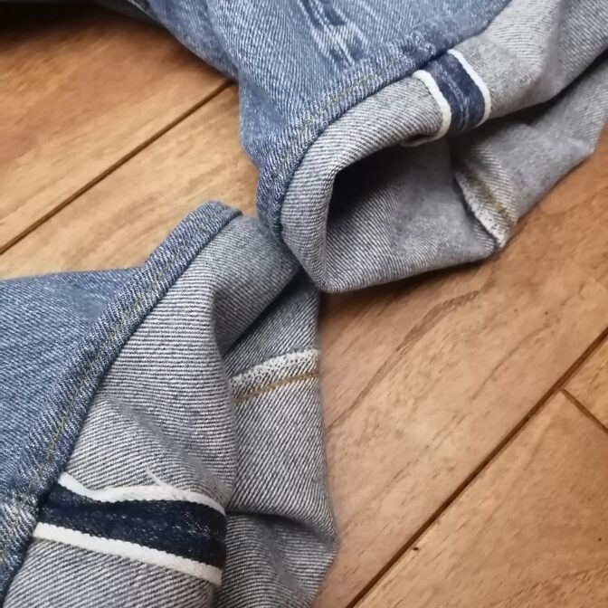 バックポケットはカンヌキ仕様(黒カンヌキ)、ポケット裏チェーンステッチ、赤耳仕様(RED LINE)です。